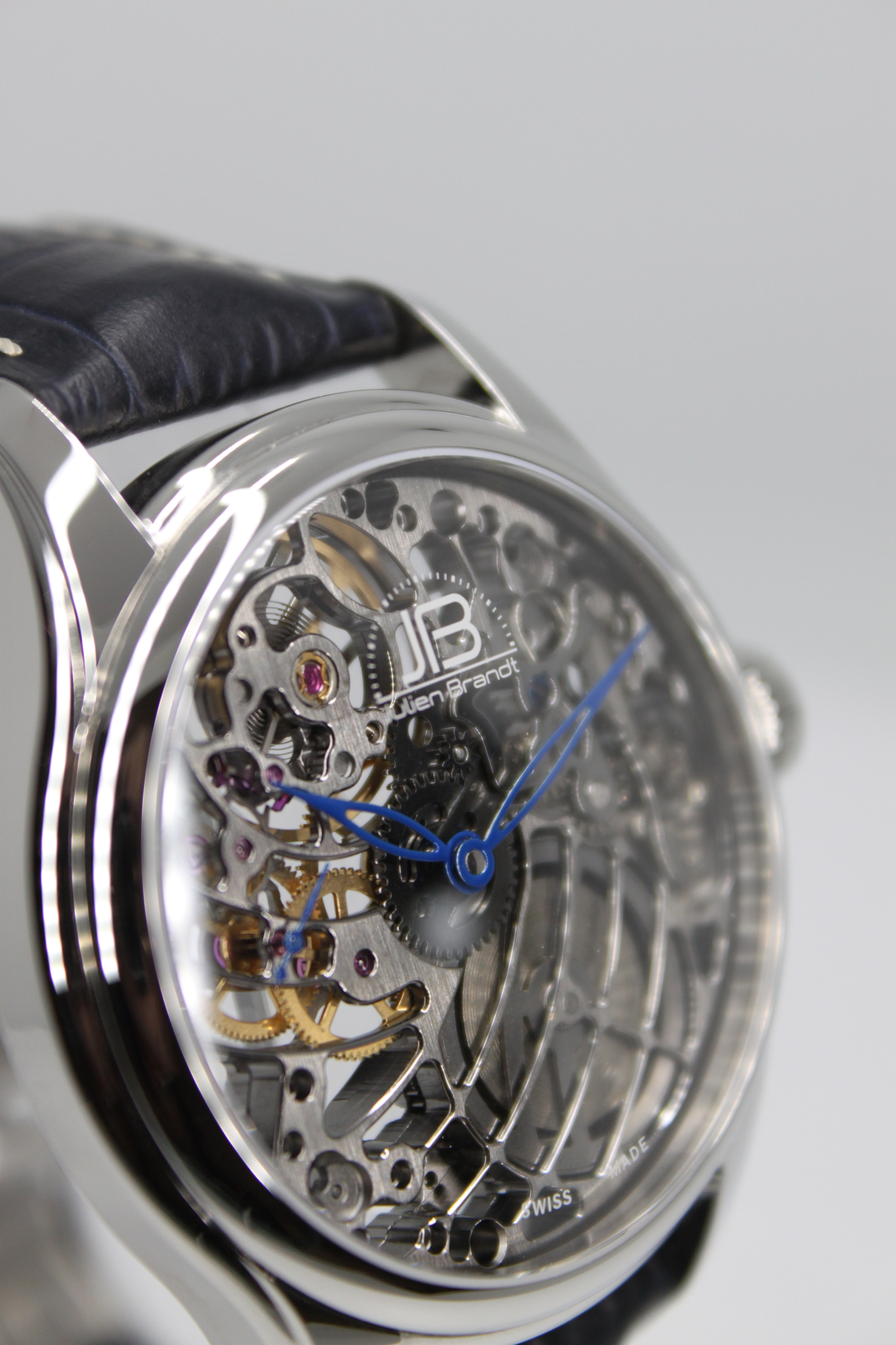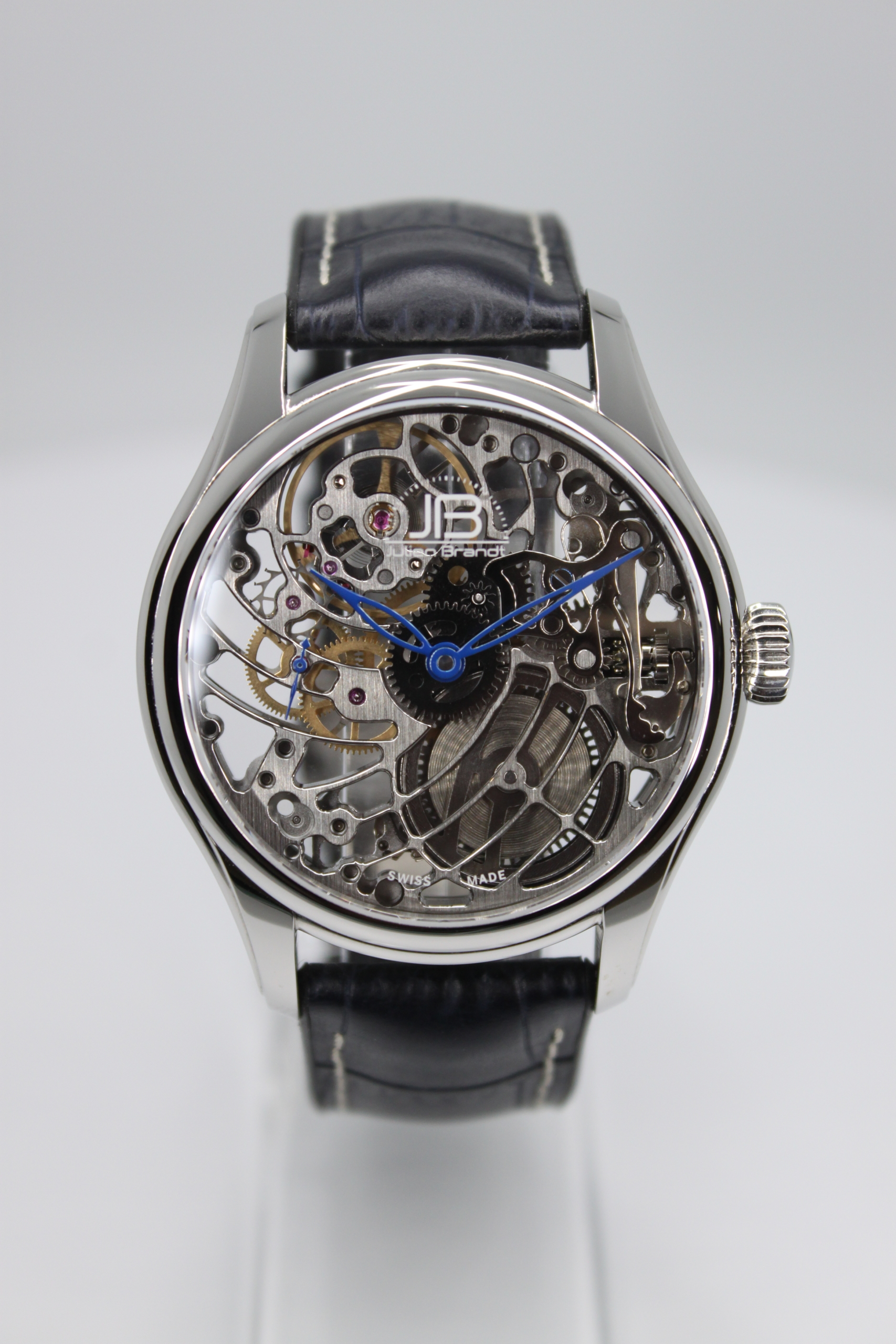 Boîte en acier avec traitement micro-céramique, étanche à 50 mètres, diamètre de 44mm, verre saphir semi-bombé, fond vitré. Mouvement mécanique squelette ETA 6497-1 à remontage manuel, réserve de 46 heures. Couleur d’aiguille et bracelet de performance personnalisables.