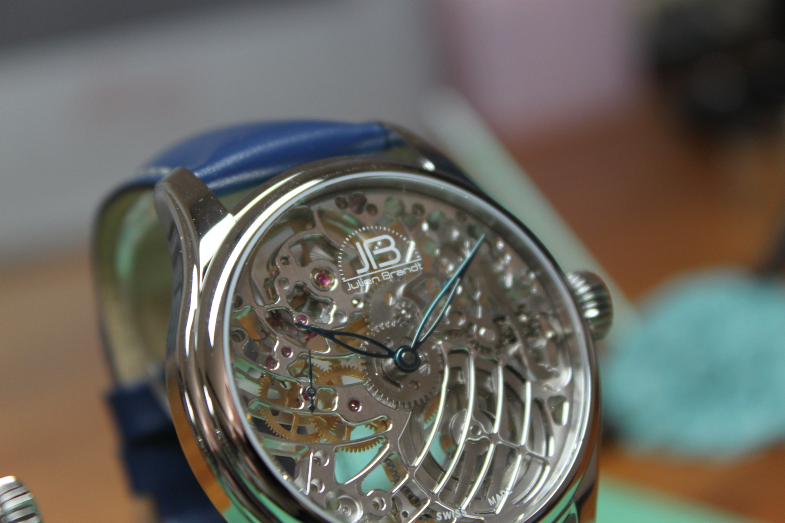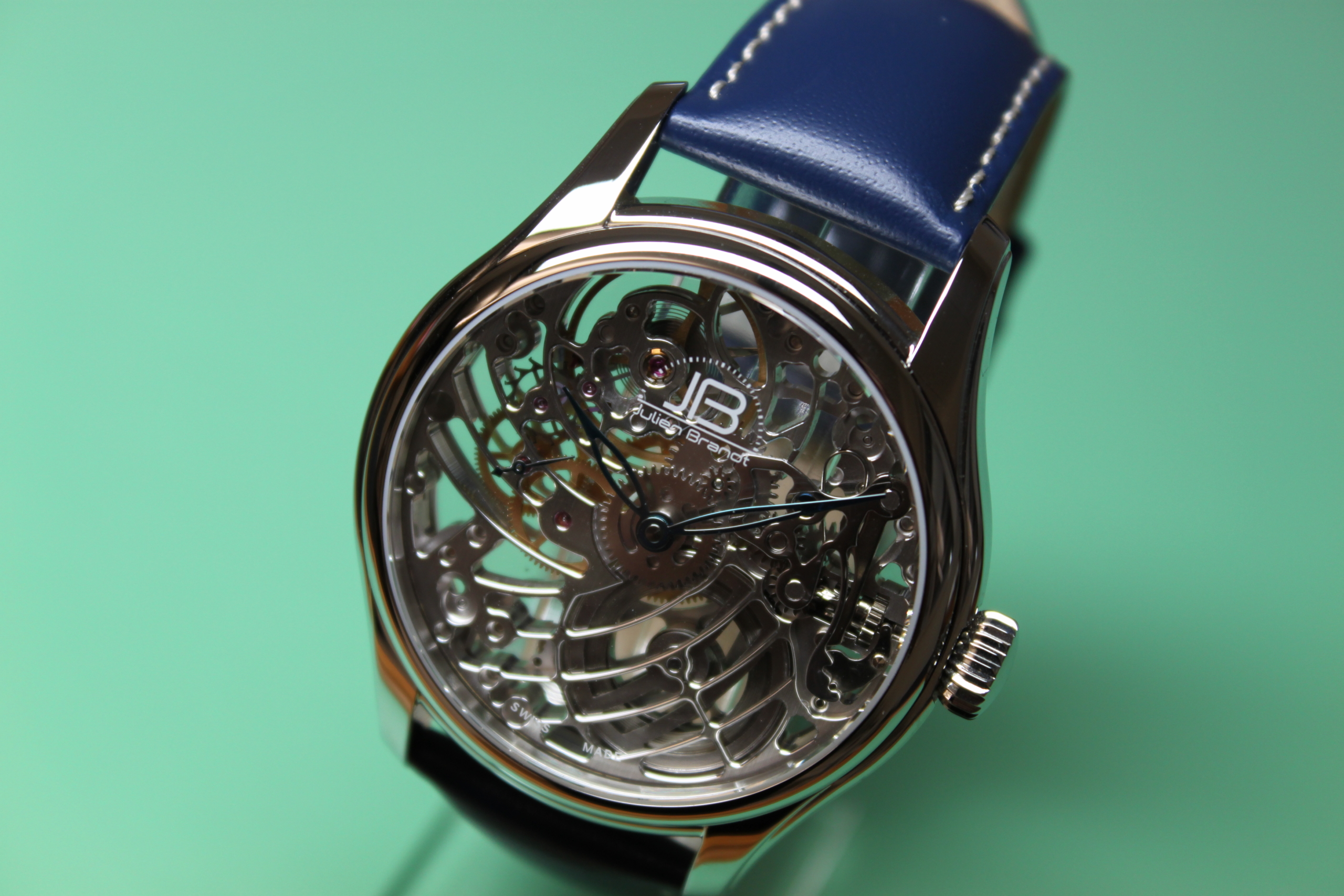Boîte en acier avec traitement micro-céramique, étanche à 50 mètres, diamètre de 44mm, verre saphir semi-bombé, fond vitré. Mouvement mécanique squelette ETA 6497-1 à remontage manuel, réserve de 46 heures. Couleur d’aiguille et bracelet de performance personnalisables.